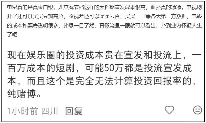 别看春节档电影拿了小10亿票房,一经回本笨重,即是因为春节档入场费太贵了,排片和宣发用度都不是极少目,终末亦然很意思,目击着2026年春节档电影票房遇冷,业内会有什么念念法吗?念念着升迁电影质料?一经念念着又是不雅众的错呢?