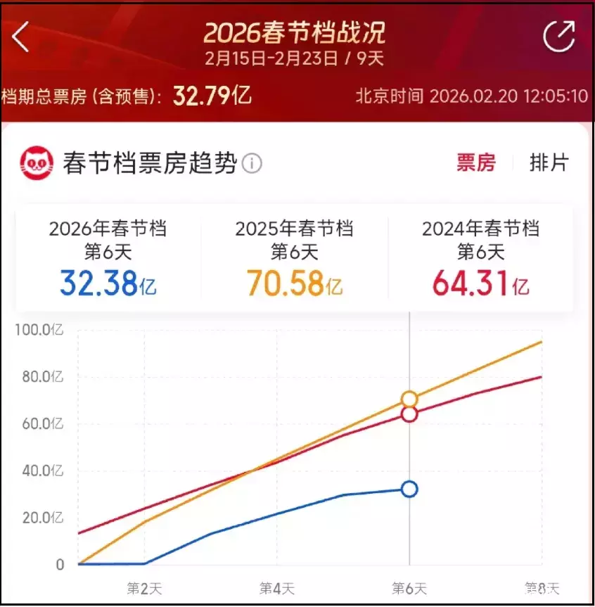 2026年春节假期最长,却成了近8年最冷春节档,当今2026年春节档8部电影沿路上映,票房面容已定,不和2025年《哪吒》带热的大盘比,就看2024年贾玲“减肥片”夺冠那一年,2026年同时累计票房都差了几十亿。
