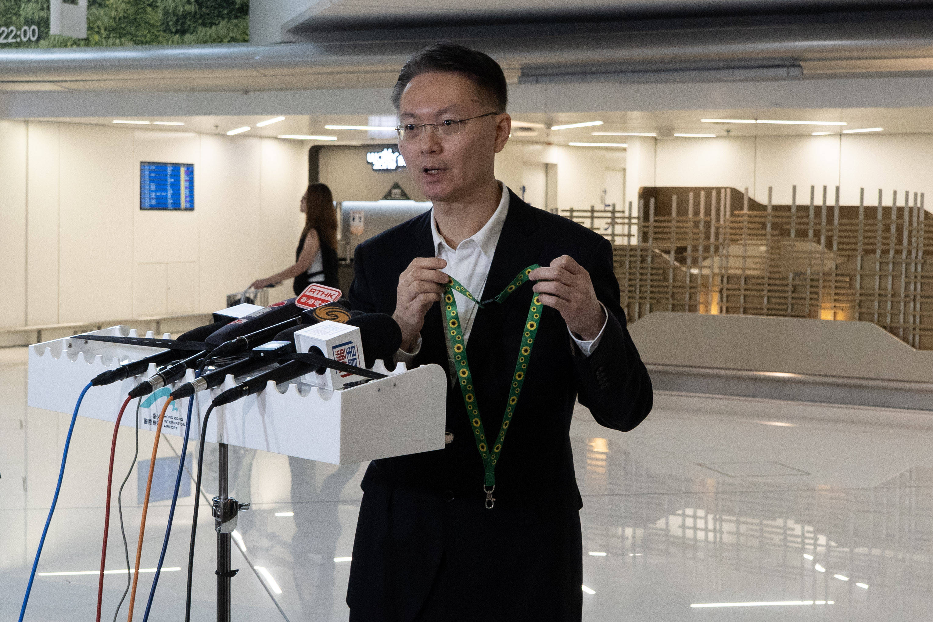 3月31日,香港机场措置局客运大楼及搭客体验总司理欧阳显宏在发布会上先容“感知阁”和向日葵挂绳。新华社发(龙镜伊 摄)让泄露照亮每一段旅程