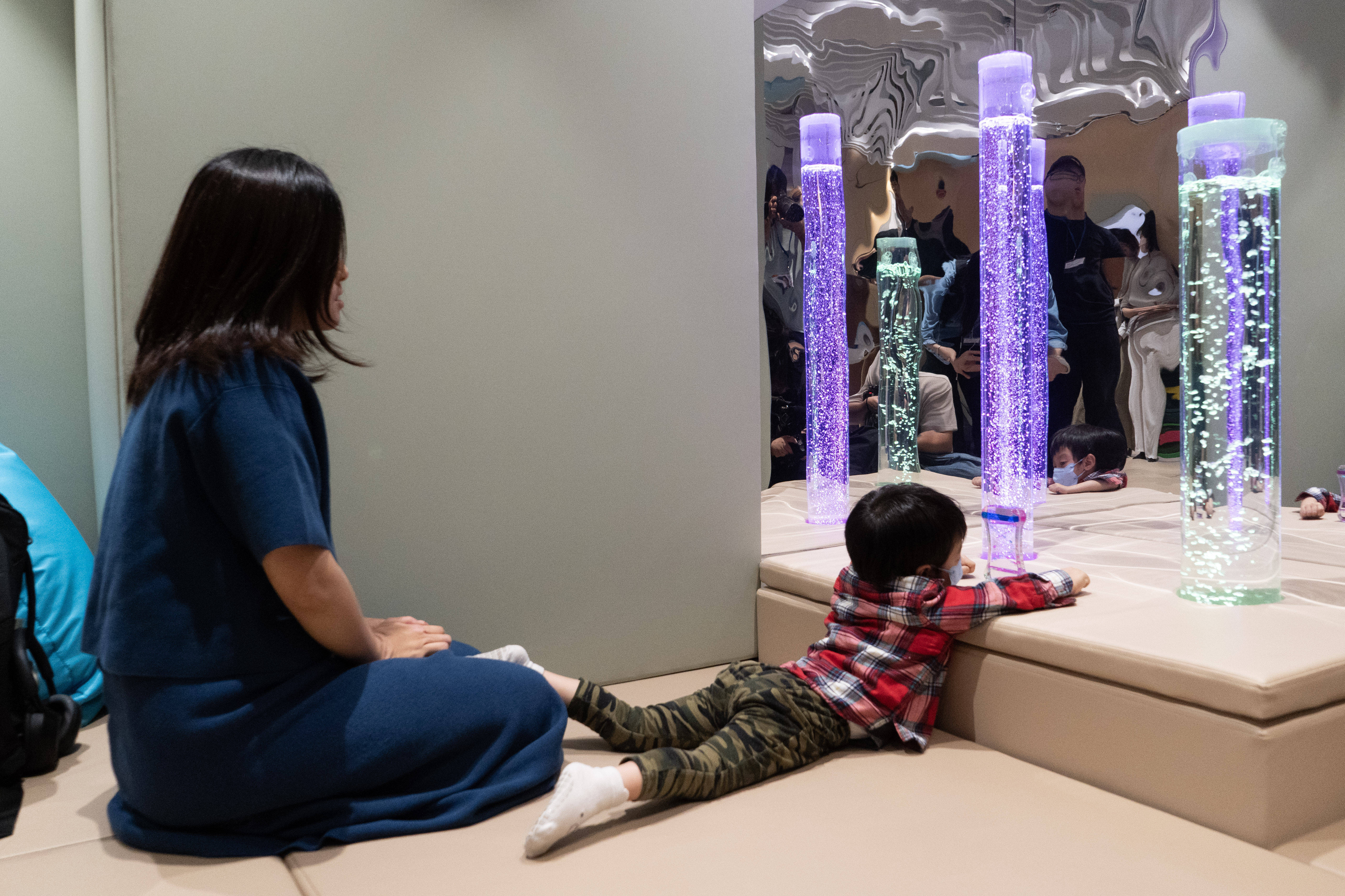 在位于香港海外机场一号客运大楼的“感知阁”内,邓女士随同被会诊为孤单症的犬子玩耍(3月31日摄)。新华社发(龙镜伊 摄)以光影与声息抚平焦躁
