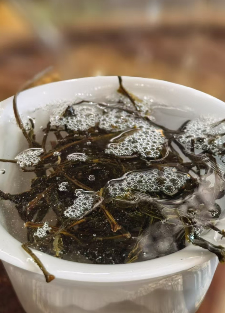 汤色:冲泡后,茶汤金黄透亮,油润感十足,杯沿有许多皂素;
