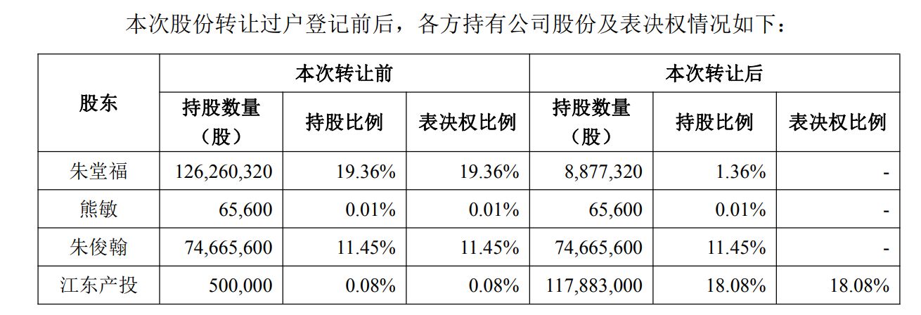 字据公告,本年7月,控股激动朱堂福与江东产投签署《股份转让公约》,商定朱堂福将其抓有的1.17383亿股(占总股本18%)以公约转让形势出让给江东产投,转让价钱为11.48元/股,转让价款系数13.48亿元。