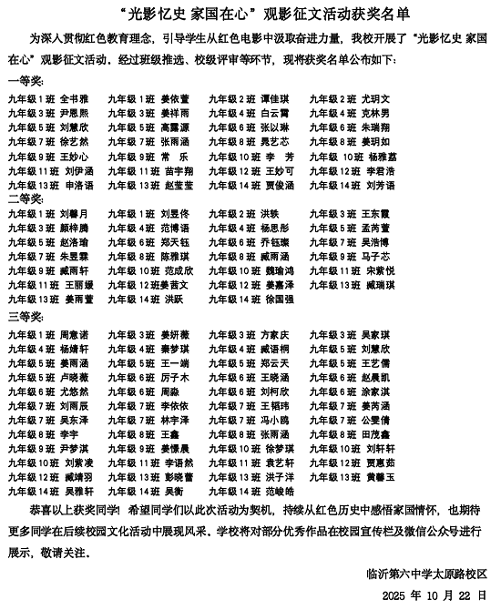 鲁网11月7日讯当红色光影照亮少年眼眸,方丈国情感流淌于字里行间,一场逾越时空的历史对话,一次直抵心灵的精神浸礼,在临沂第六中学太原路校区温顺终结。10月份“光影忆史 家国在心”2023级不雅影征文四肢,让同学们在银幕中回望岁月峥嵘,在文字间表达小儿情感,交出了一份兼具念念想深度与芳华温度的成长答卷。