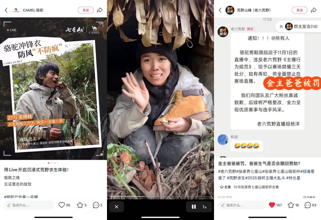 户外畅通品牌骆驼援手了本届赛事,其居品在直播和采访中通常清楚。在一些直播切片中,骆驼关系直播间以致在比赛技能邀请选手出镜“带货宣传”。据《财经六合》报谈,赛事技能骆驼品牌搜索量暴涨30%,选手同款装备销量看涨;双11技能,骆驼在天猫平台开售30分钟销售额即破亿,并一度位列抖音畅通户外品牌榜榜首。