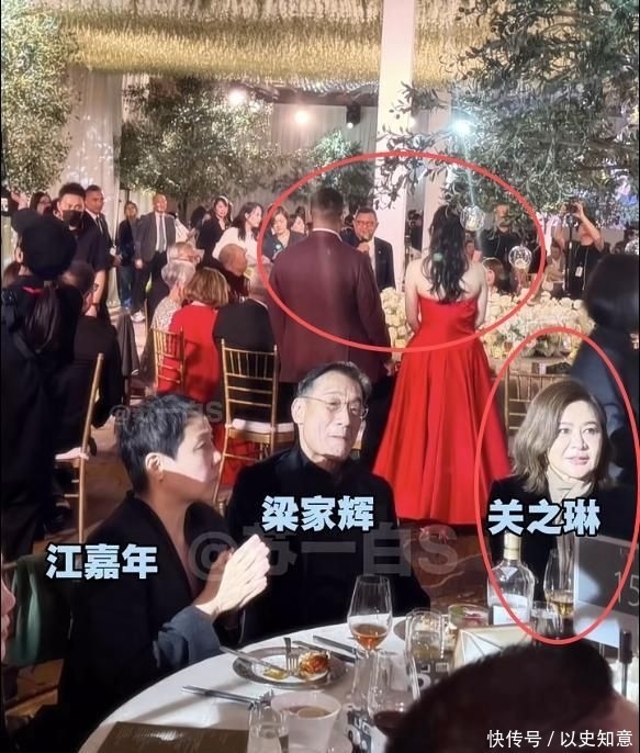 她与梁家辉爱妻同坐一桌,三东说念主互动略显懒散,位置距离主宾席稍远,恰巧新郎新娘敬酒时背对着他们,画面看上去就像平庸来宾一般,毫无主角光环。
