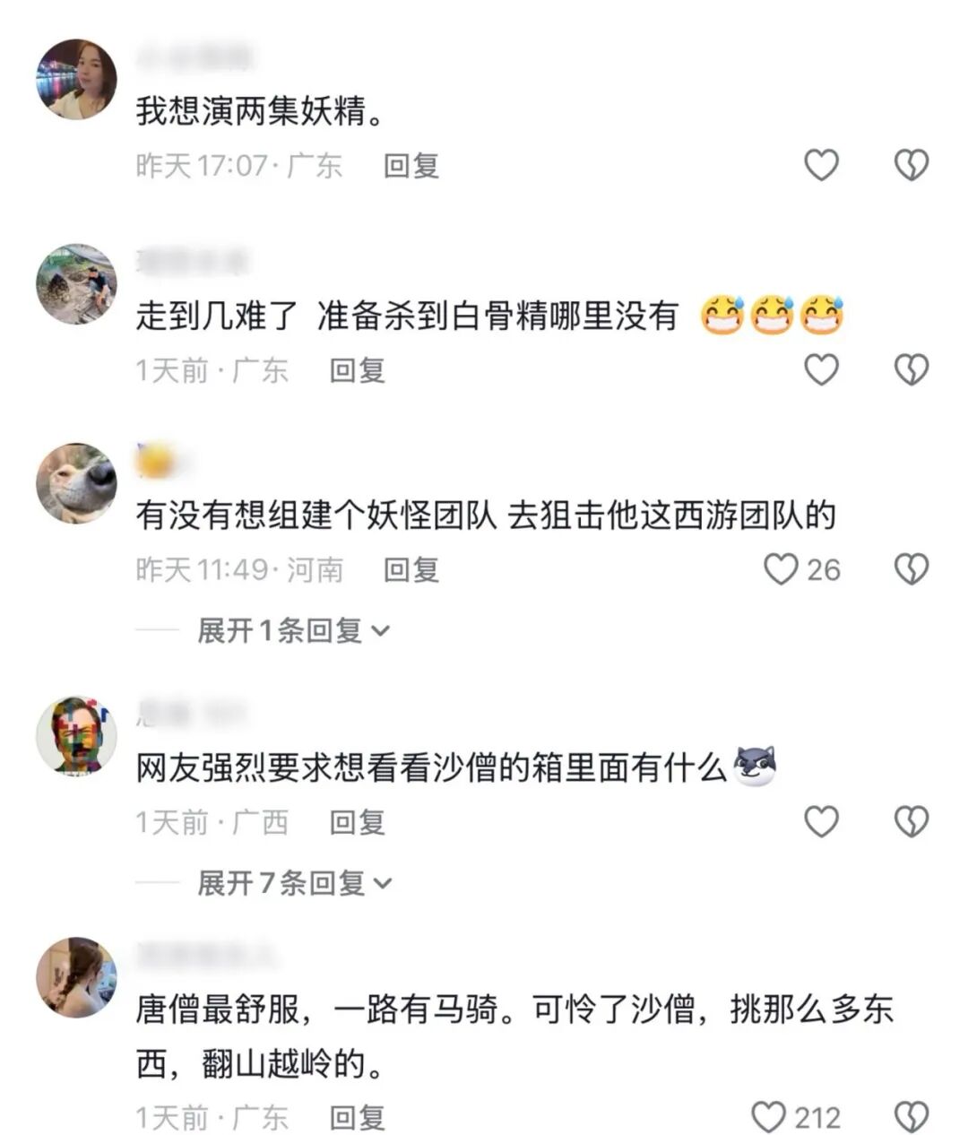 有网友说,我想演两集妖魔;还有更绝的留言,要组个妖魔团队去狙击他们;也有网友好奇沙僧的箱子里王人装了什么。