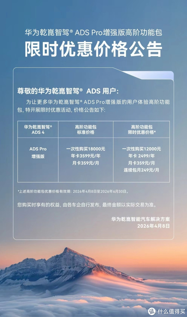 华为乾崑智驾近日放出重磅音书:ADS Pro增强版高阶功能包开启限时优惠。