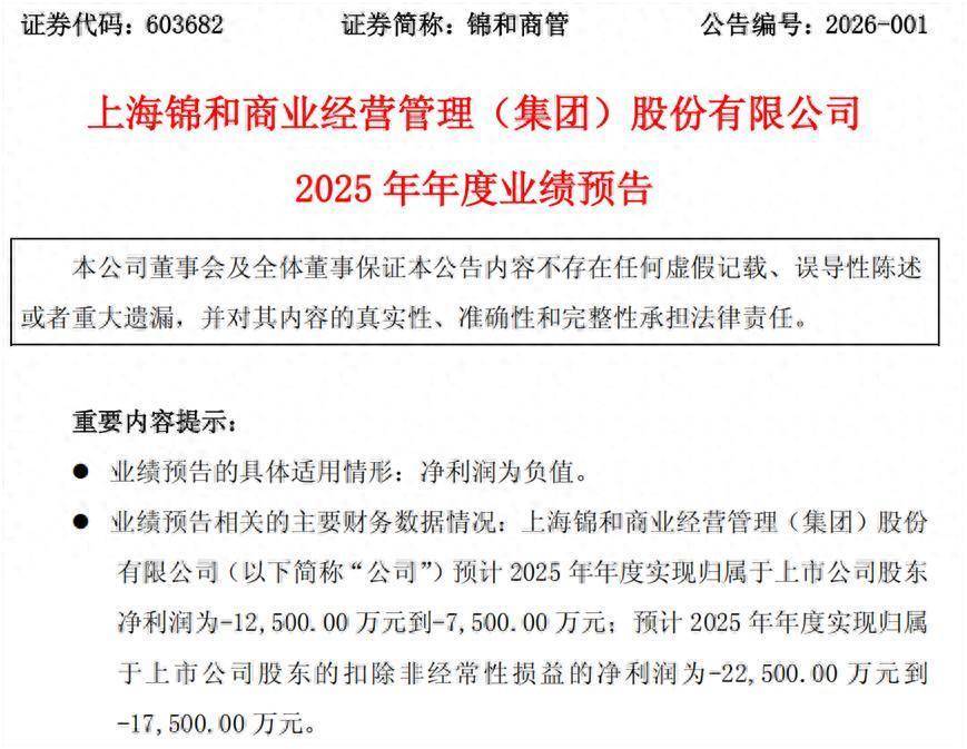 1月20日晚间,上海锦和买卖盘算推算处置(集团)股份有限公司(证券代码:603682,证券简称:锦和商管)发布2025年年度功绩预报,公司瞻望2025年包摄于上市公司激动净利润为-12,500.00万元至-7,500.00万元,扣除非时常性损益的包摄于上市公司激动净利润为-22,500.00万元至-17,500.00万元,功绩呈现升天状态。