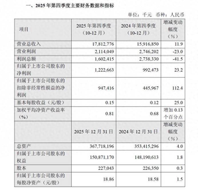 公司称,2025 年第四季度利润总数较上年同期减少,主如果由于本季度财务用度高潮及投资收益下落所致。2025 年第四季度包摄于上市公司激动的扣除特别常性损益的净利润较上年同期加多,主如果由于本季度晶圆销售量加多、产能支配率高潮及产物组合变动所致。
