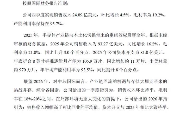 中芯海外同期发布2026年带领:在外部环境无要紧变化的前提下,瞻望2026年销售收入增幅高于可比同行的平均值,成本开支与2025 年比较轻便握平;一季度带领为销售收入环比握平,毛利率在18%-20%之间。